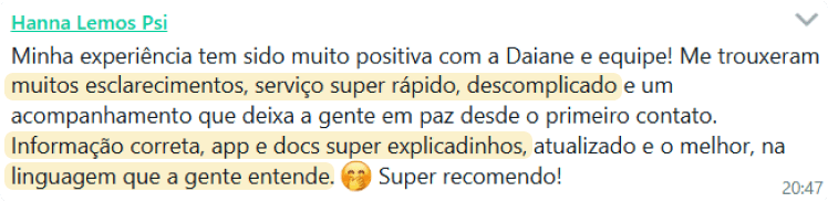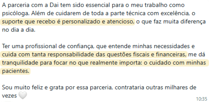 Em 2023 decidi direcionar a minha comunicação e me especializar em contabilidade para psicólogas e demais profissionais da saúde e desde então são mais de 100 clientes assessoradas por mim e minha equipe.